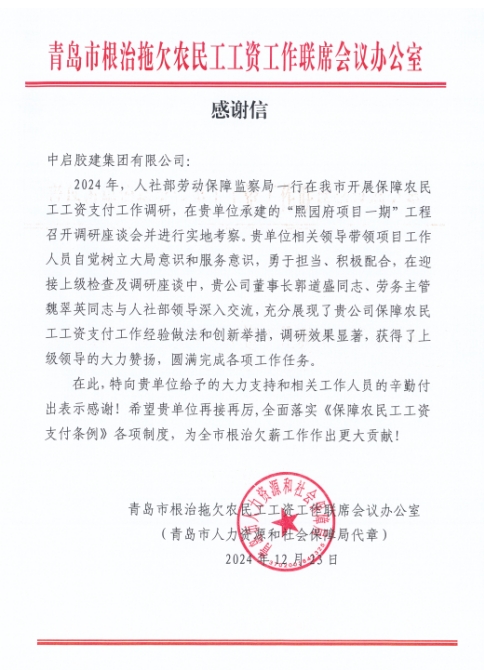 2024年,在公司領(lǐng)導(dǎo)的正確帶領(lǐng)下,在各單位各項(xiàng)目的大力支持和相關(guān)工作人員辛勤付出下,公司在保障農(nóng)民工工資支付工作方面先后圓滿完成了各項(xiàng)調(diào)研、檢查工作并取得了優(yōu)異成績。為表彰我公司在保障農(nóng)民工工資支付工作方面做出的突出貢獻(xiàn),青島市人社局、膠州市人社局分別向公司發(fā)來感謝信,對(duì)公司及在調(diào)研、檢查工作中做出突出貢獻(xiàn)的先進(jìn)項(xiàng)目和先進(jìn)個(gè)人魏翠英、楊國鋒進(jìn)行通報(bào)表揚(yáng)。