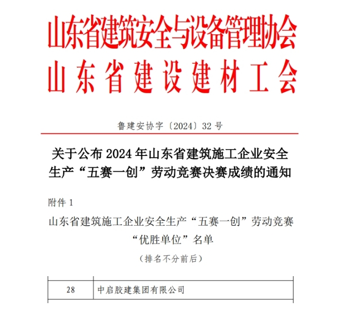 近日,2024年山東省建筑施工企業(yè)安全生產(chǎn)“五賽一創(chuàng)”勞動競賽活動圓滿落幕。其中,中啟膠建集團(tuán)有限公司被評選為山東省建筑施工企業(yè)安全生產(chǎn)“五賽一創(chuàng)”勞動競賽“優(yōu)勝單位”,公司承建的青島空港綜合保稅商品展示交易中心項(xiàng)目被評為“優(yōu)勝班組”,膠州公司劉文基被評選為“優(yōu)勝個人”。