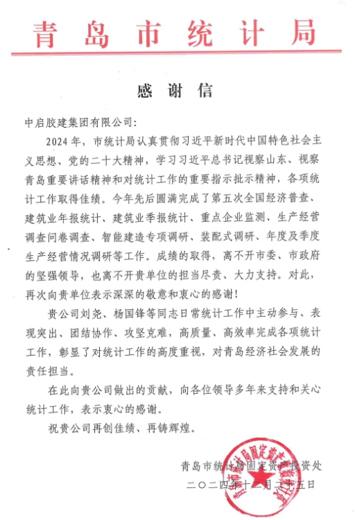青島市統(tǒng)計(jì)局特向公司發(fā)來(lái)感謝信,對(duì)公司在統(tǒng)計(jì)工作中擔(dān)當(dāng)盡責(zé)、大力支持所做出的貢獻(xiàn)表示感謝,并對(duì)公司相關(guān)同志在日常統(tǒng)計(jì)工作中主動(dòng)參與、表現(xiàn)突出、團(tuán)結(jié)協(xié)作、攻堅(jiān)克難,高質(zhì)量、高效率完成各項(xiàng)統(tǒng)計(jì)工作提出表?yè)P(yáng)。